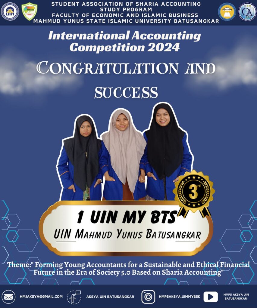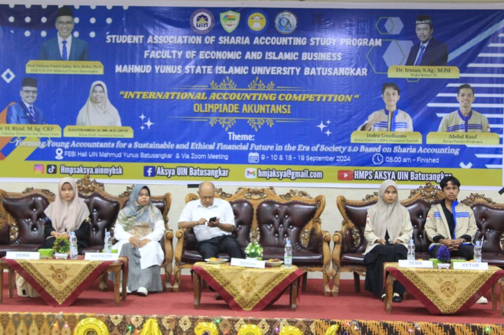 Dengan mengusung tema “Forming Young Accountants for a Sustainable and Ethical Financial Future in the Era of Society 5.0 Based on Sharia Accounting”, acara ini dibuka secara resmi pada tanggal 09 September 2024, oleh Dr. Nofrivul., SE., MM., CFRM Sebagai Wakil Dekan I yang mewakili Dekan FEBI dan Pada Tanggal 19 September 2024 acara ditutup lansung oleh Dr. Wahidah Fitriani, S.Psi, MA sebagai Wakil Dekan III yang Mewakili Dekan FEBI UIN Mahmud Yunus Batusangkar Himpunan Mahasiswa Program Studi (HMPS) Akuntansi Syariah Tahun 2024 memiliki salah satu program kerja yaitu mengadakan suatu kegiatan yang melibatkan mahasiswa/I baik negeri dan swasta. Kegiatan tersebut adalah International Accounting Competition. Lingkup Internasional ini diantaranya Indonesia, Malaysia, dan China yang telah ikut serta dalam kegiatan ini. Pelaksanaan kegiatan ini dilandasi oleh beberapa fakta empiris diperguruan tinggi yang menunjukkan bahwa pembelajaran terkait mata kuliah Akuntansi merupakan pembelajaran yang selalu menarik untuk diikuti oleh para mahasiswa/I yang sering menunjukkan bahwa pembelajaran cenderung dianggap sangat sulit. Pelaksanaan pembelajaran yang masih cenderung mengandalkan keaktifan dosen didepan kelas, materi yang disampaikan cenderung tidak membumi, sebagia besar mahasiswa/I juga beranggapan bahwa materi Akuntansi identik dengan hitung-hitungan yang menyulitkan. Muara dari berbagai hal tersebut adalah masiswa/I menjadi kurang memiliki bekal yang cukup baik untuk memahami berbagai hal transaksi akuntansi, kurang memiliki kecakapan untuk bersaing dalam dunia yang berevolusi, kurang siap mendalami ilmu akuntansi pada jenjang yang lebih tinggi, dan kurang mengaplikasikan hasil pembelajaran dalam kebiasaan berfikir dan bertindak.