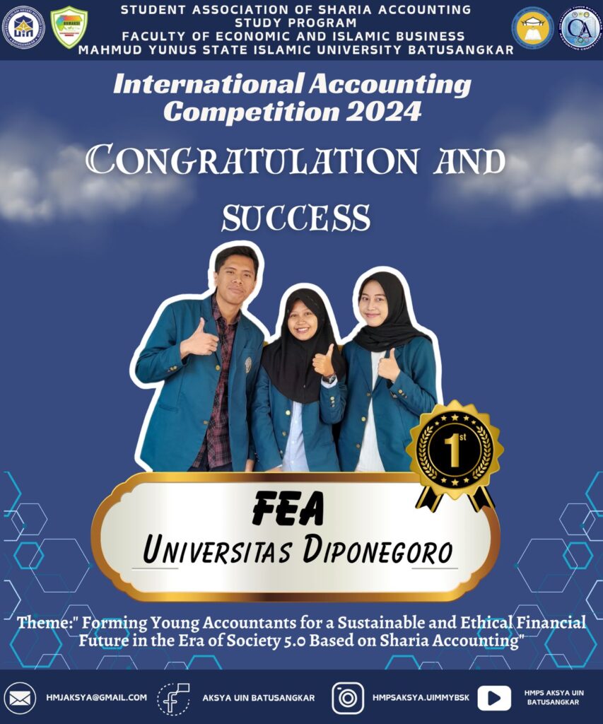Himpunan Mahasiswa Program Studi Akuntansi Syariah Fakultas Ekonomi dan Bisnis Islam (HMPS Aksya FEBI) UIN Mahmud Yunus Batusangkar sukses menggelar acara International Accounting Competition 2024, Sebuah kegiatan yang bertujuan untuk meningkatkan pemahaman tentang Akuntansi tingkat mahasiswa/I Dengan skala Internasional sehingga terciptanya Akuntan Muda untuk Masa Depan Keuangan yang Berkelanjutan dan Beretika di Era Society 5.0 Berlandaskan pada Akuntansi Syariah.